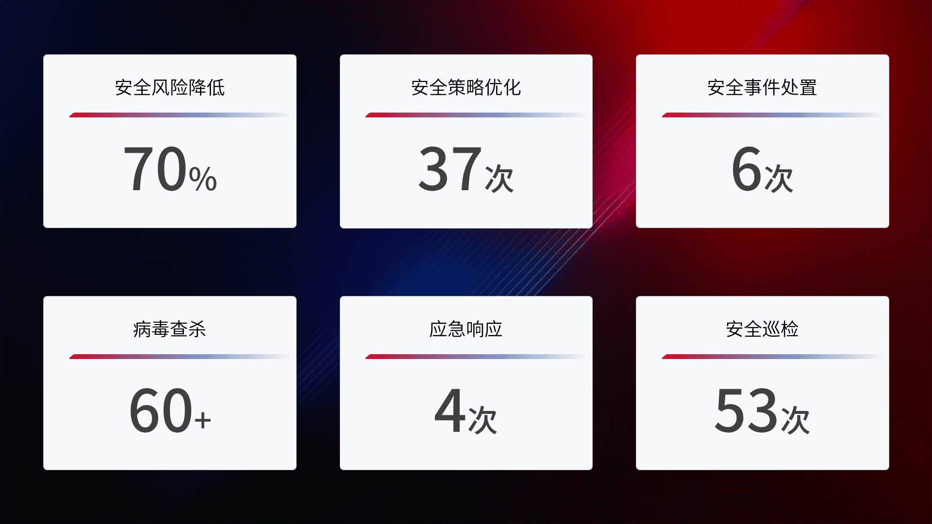 提供全面的安全事件报告体系,,,包括处置报告、、周报、、季度和年度总结,,结合持续监控,,,帮助客户深入了解网络安全状况。。。。
